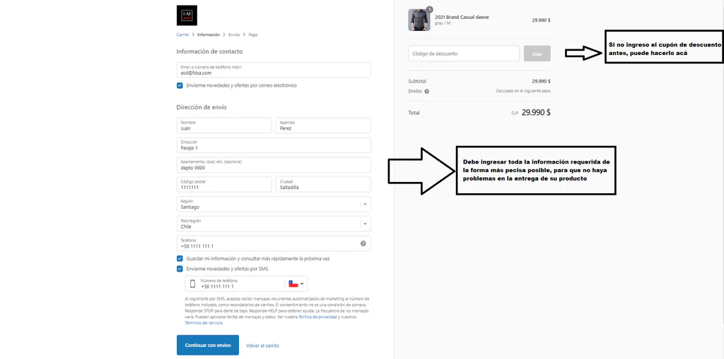 On this screen you must enter your information for shipping and billing, it is important that you enter REAL shipping data, such as your full name, address, email and contact number, you can also add your Rut to speed up the shipping process as much as possible (you can add it in the field that says optional), the more precise and detailed the information is, the less likely there is to be a problem later in the dispatch of your order, once the information is entered you can continue with Shipping.