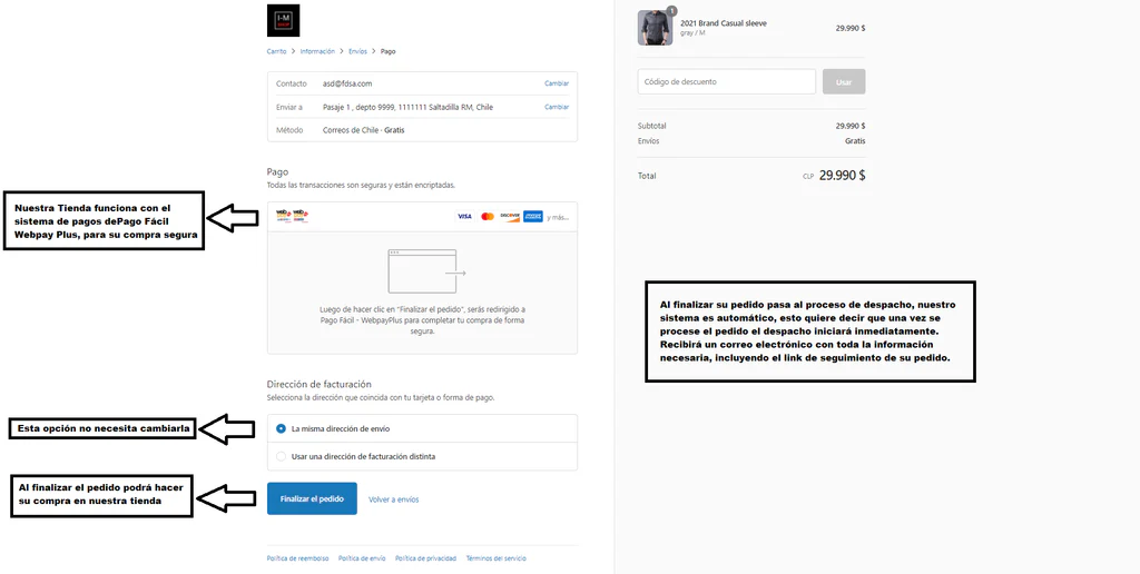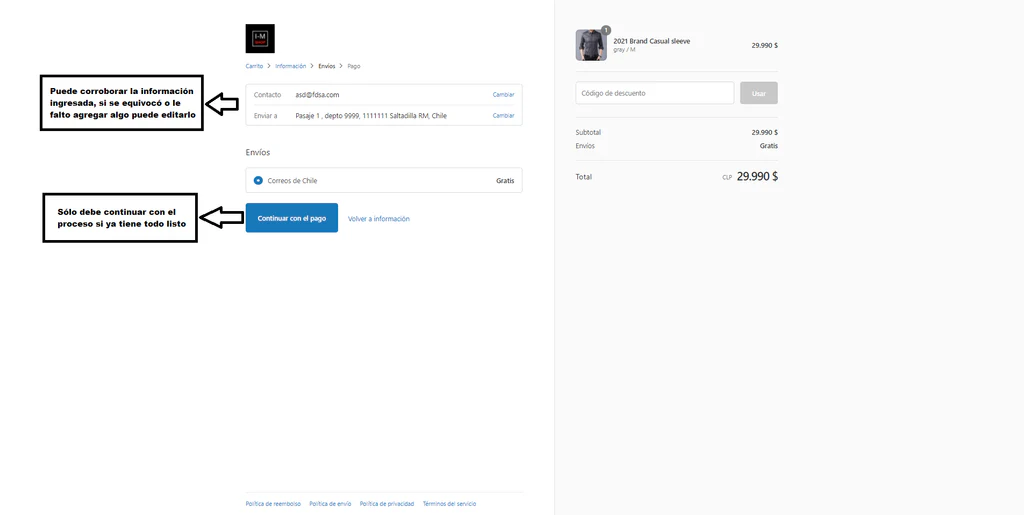Our shipping system is free through Correos de Chile. In this section you can go back if any information is missing or you want to add something else.